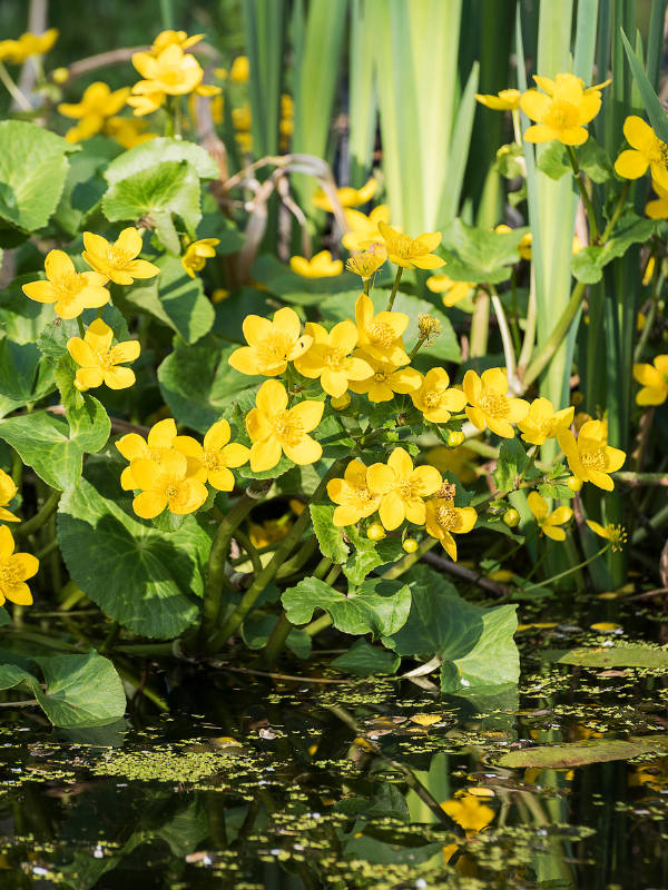 Also known as Kingcup, Marsh Marigold is a perennial marginal plant found across the UK in wet areas like pond margins, ditches and meadows. It belongs to the buttercup family (Ranunculaceae), but sits in its own genus: Caltha.