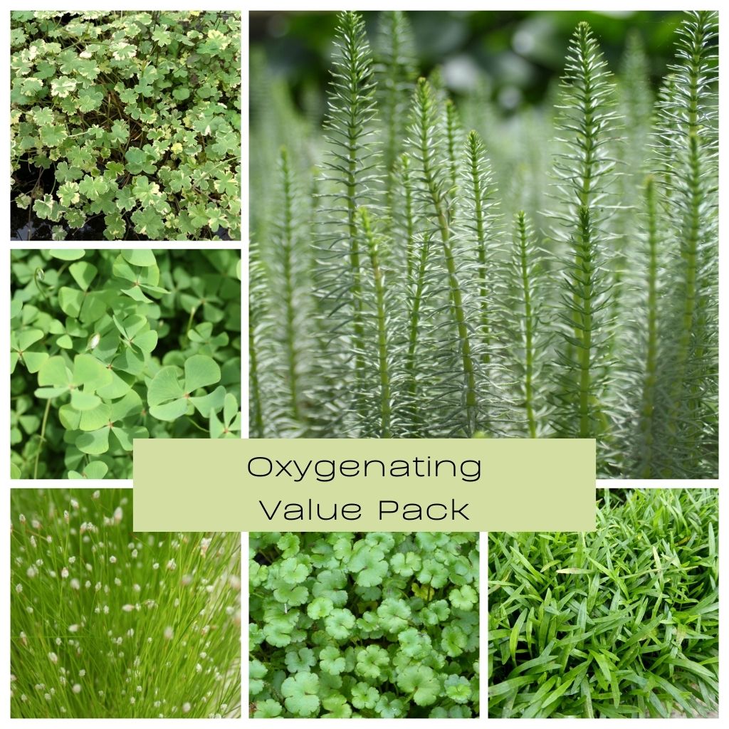 All of the plants in this collection are to be placed at the bottom of your pond or on the shelves (depending on depth) and will start producing oxygen through photosynthesis, which they will release into the water.