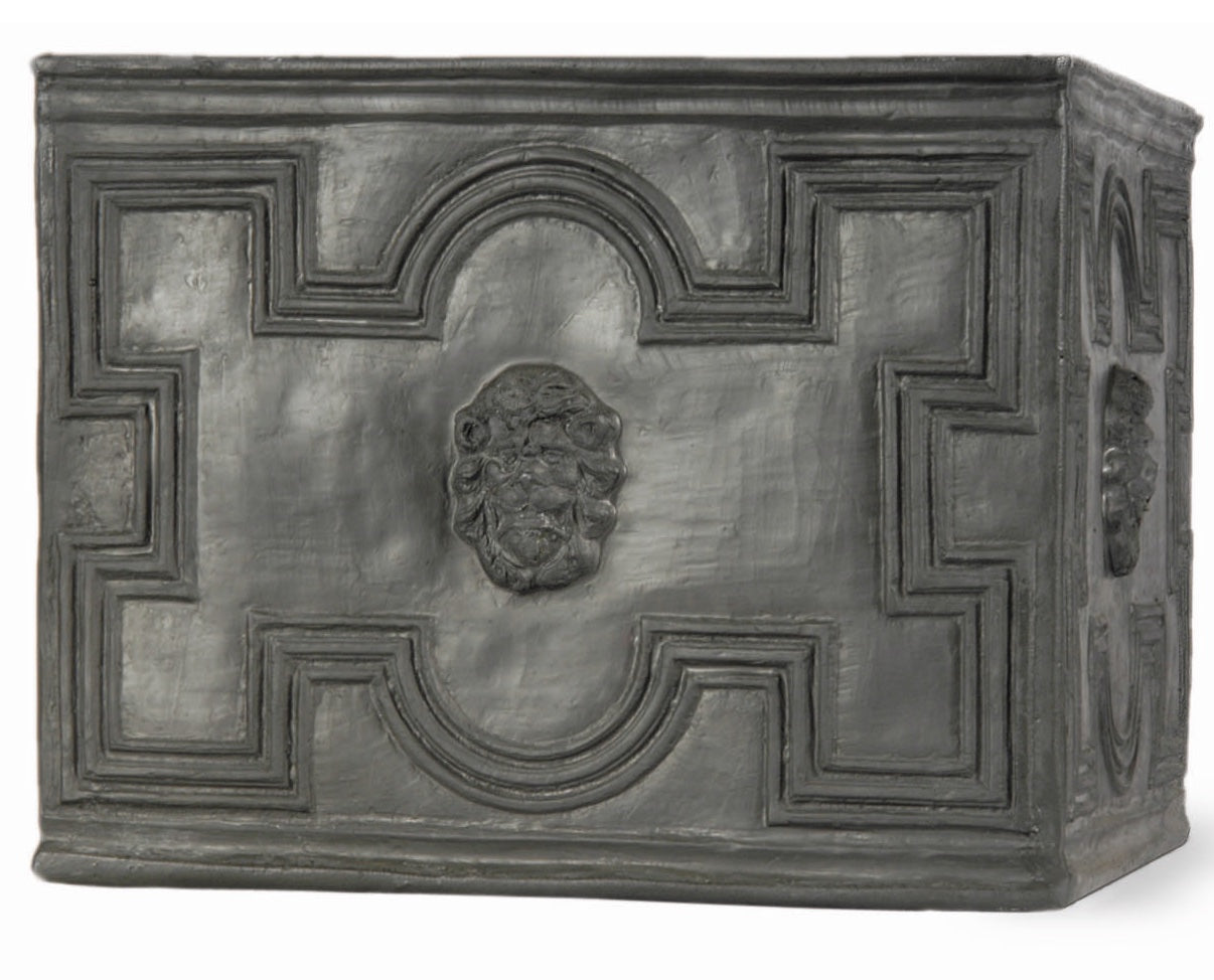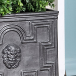 Stately planter with lion head detailing and faux lead finish; perfect for formal gardens or container ponds.