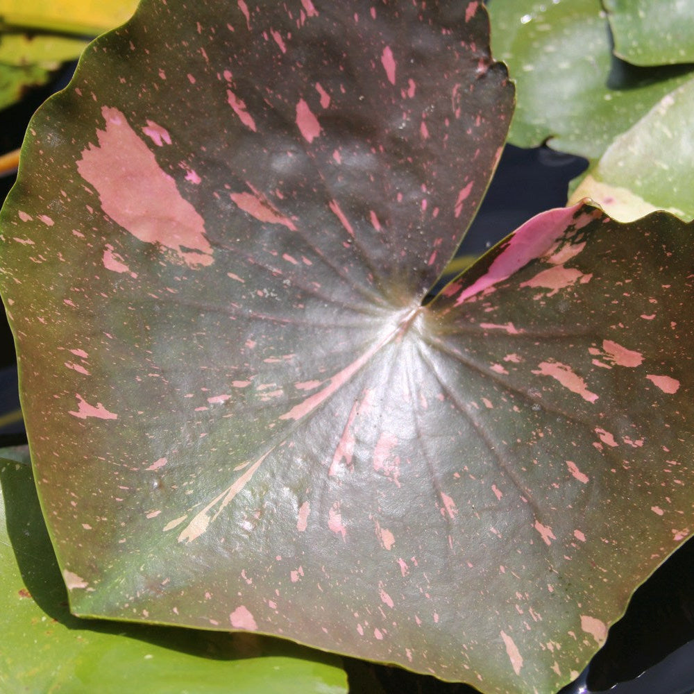 Its unique variegated foliage, with marbled patterns in red-brown, pink, cream, and green, adds vibrant visual interest even when not in bloom. Thriving in full sun and still waters, this waterlily is perfect for medium ponds, providing beauty and supporting local wildlife, including pollinators.
